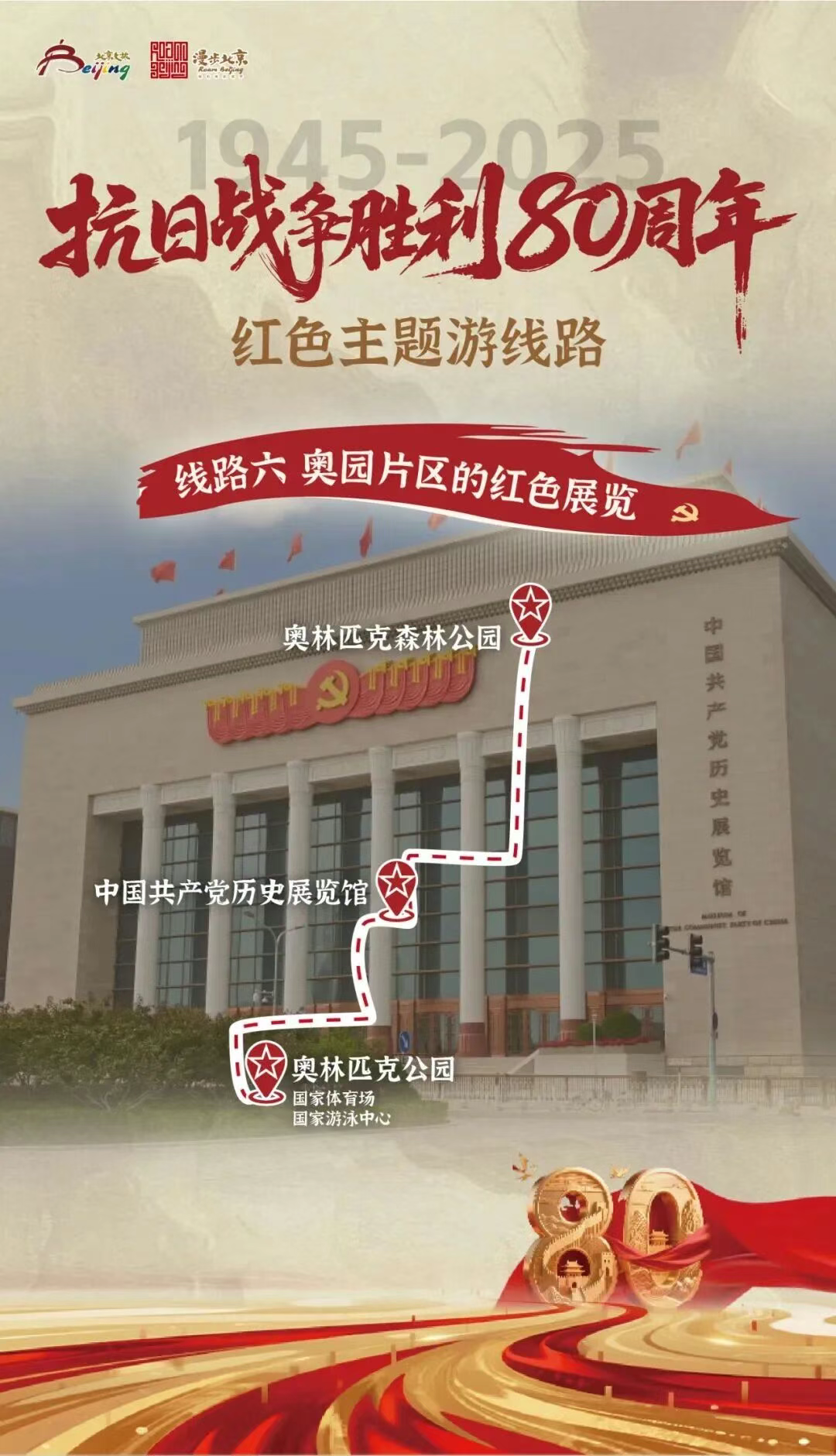 线路:奥林匹克公园(国家体育场、国家游泳中心)→中国共产党历史展览馆→奥林匹克森林公园。