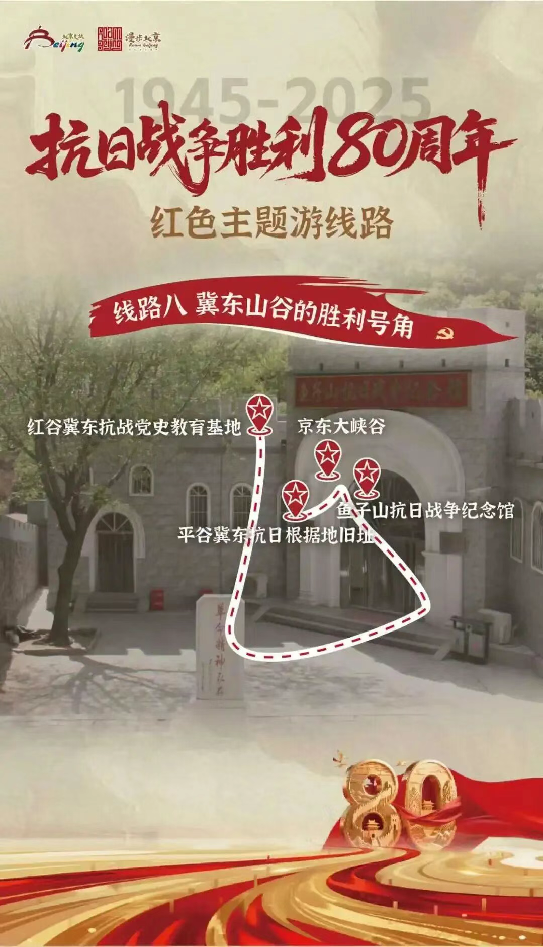 线路:平谷冀东抗日根据地旧址→京东大峡谷→鱼子山抗日战争纪念馆→红谷冀东抗战党史教育基地。
