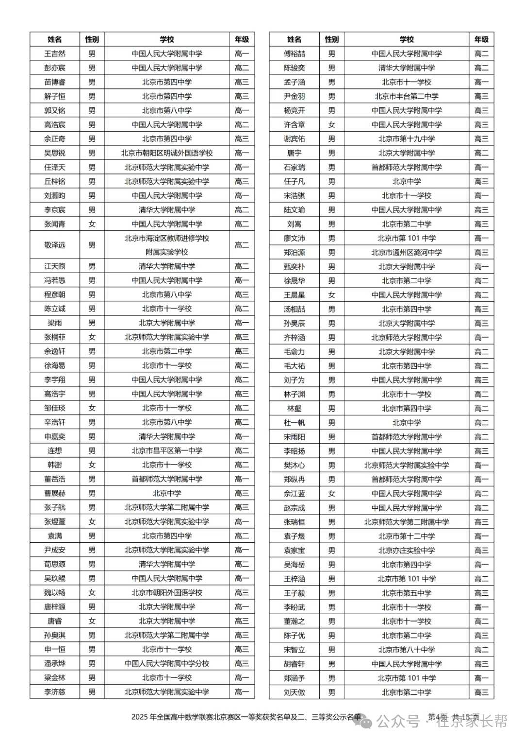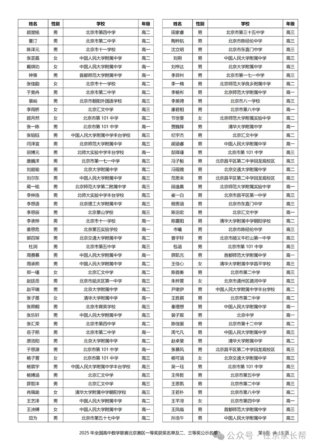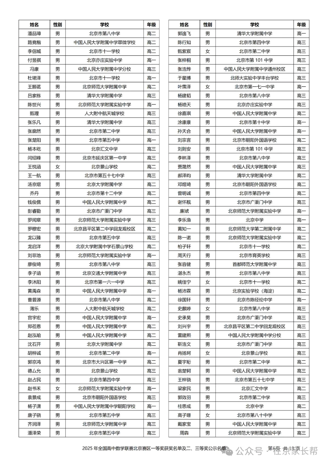 2025年全国高中数学联赛北京省队、省一二三获奖名单公布!恭喜各位获奖考生!本届数学竞赛具体获奖名单跟随北京小升初信息网一起来看!