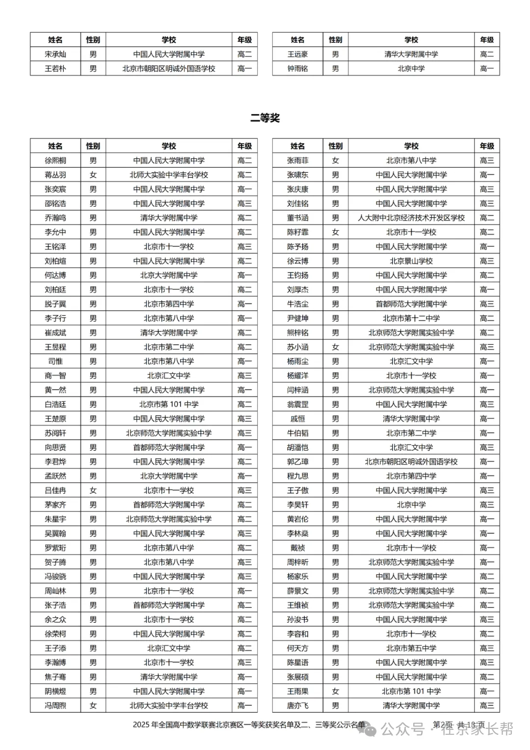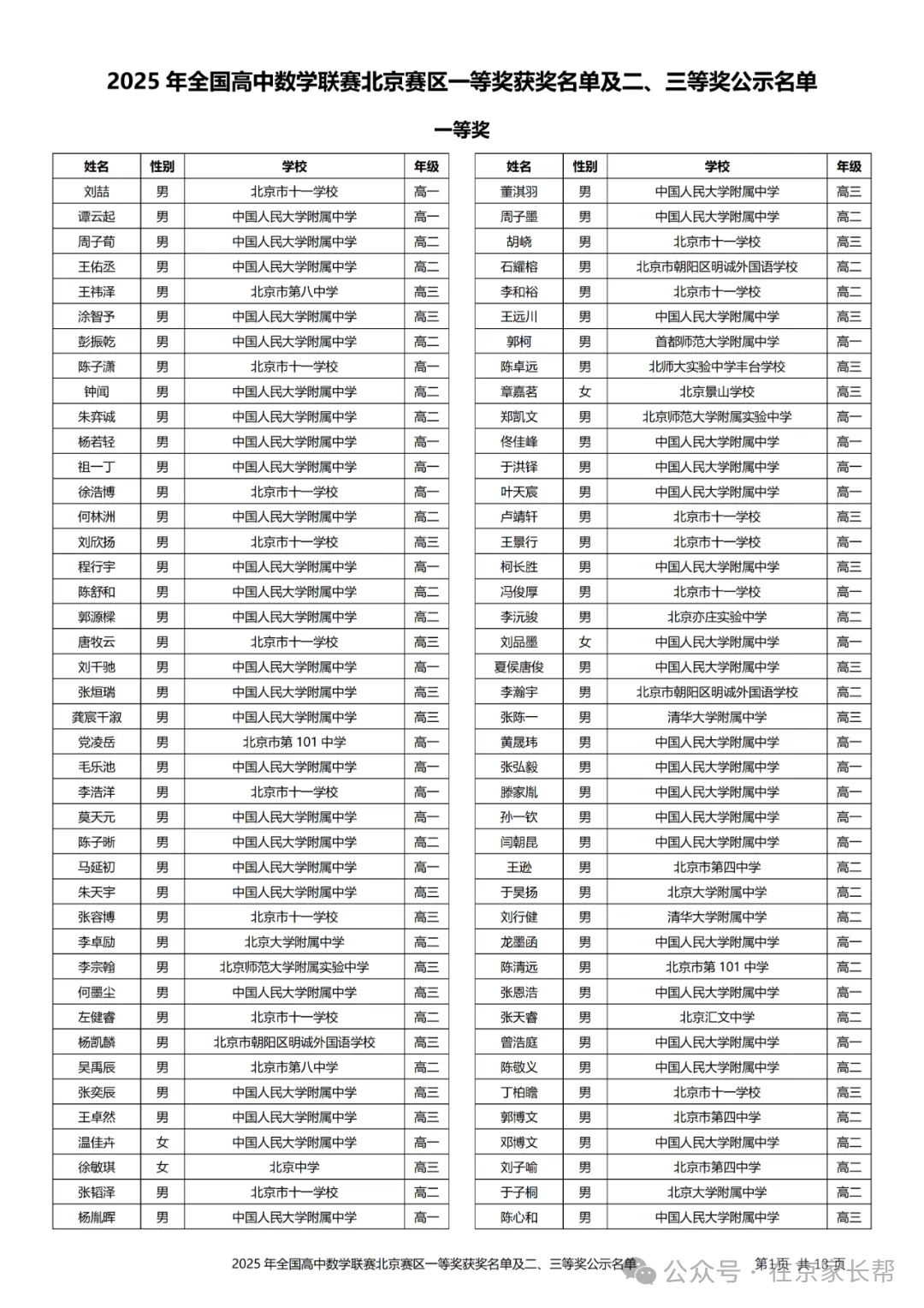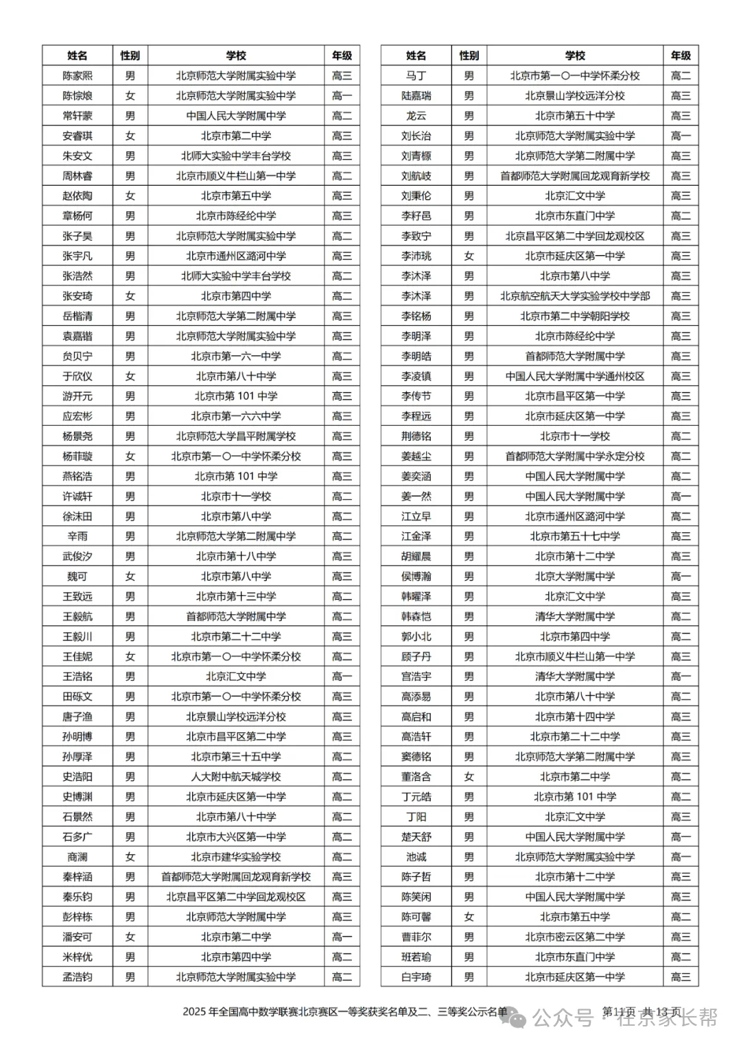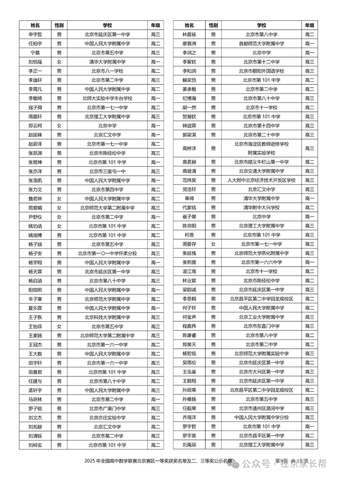 2025年全国高中数学联赛北京省队、省一二三获奖名单公布!恭喜各位获奖考生!本届数学竞赛具体获奖名单跟随北京小升初信息网一起来看!
