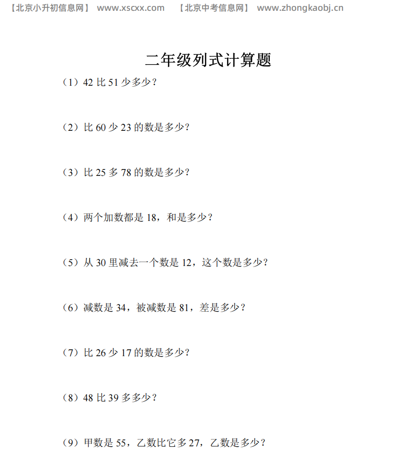 北京小升初信息网给大家整理了多道二年级列式计算题,涵盖加减乘除、倍数、平均分等题型,搭配完整参考答案,帮助学生巩固数量关系理解,提升列式与计算能力,以下是部分内容截图预览: