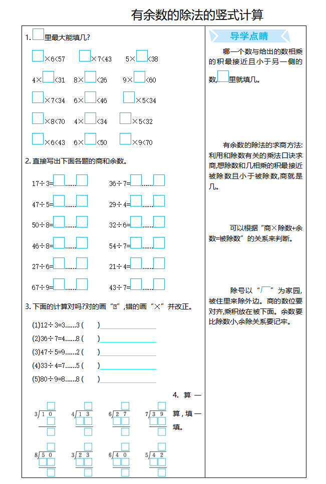 本文含有余数除法填数、求商余、改错及填空题型,附导学点睛,搭配答案,帮助学生掌握试商方法与竖式规范,理解余数小于除数规则,和北京小升初信息网一起看看!以下是部分内容截图预览: