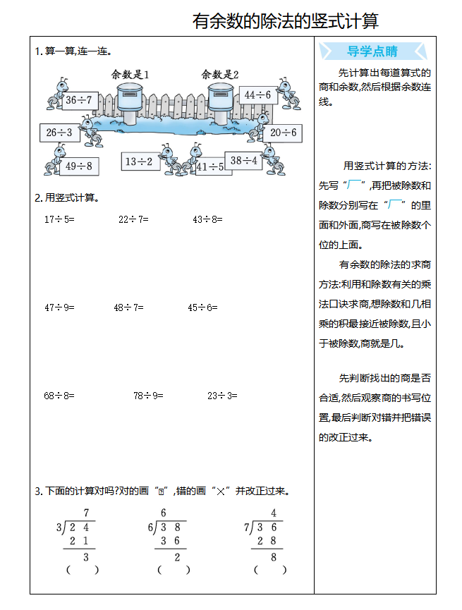 本文含有余数除法连线、竖式计算及改错题型,附导学点睛,搭配答案,帮助学生巩固竖式书写规范与试商方法,强化余数判断能力,和北京小升初信息网一起看看!以下是部分内容截图预览: