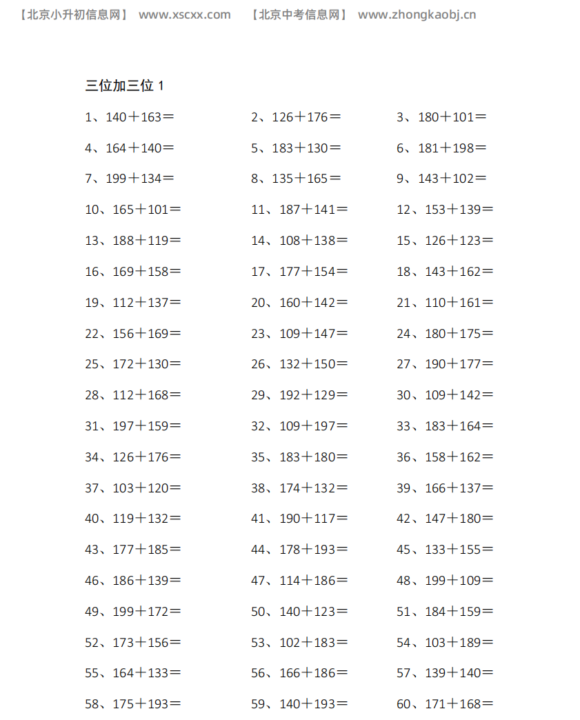 本文含多篇三位加三位计算题,每篇60道题,数值涵盖100-500范围,题型统一包含三位数加法运算,帮助学生巩固三位数加法计算能力,提升运算准确性,和北京小升初信息网一起看看!以下是部分内容截图预览: