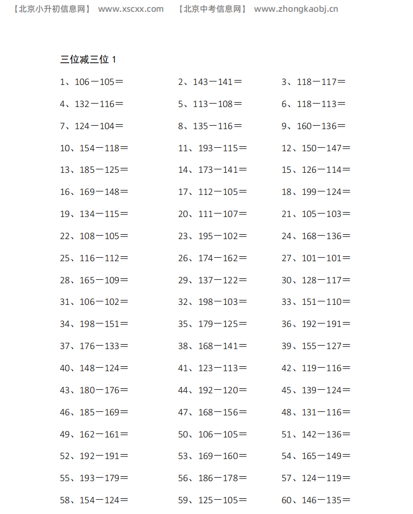 本文含多篇三位减三位计算题,每篇60道题,数值覆盖100-800范围,包含三位数减法运算,帮助学生巩固三位数减法计算规则,提升运算准确性与熟练度。,和北京小升初信息网一起看看!以下是部分内容截图预览: