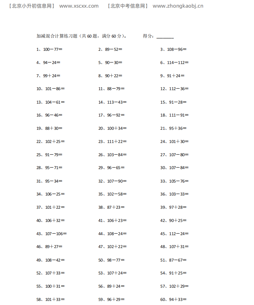 文档含多篇100以内加减混合计算题,每篇60题(满分60分),包含两位数与三位数加减运算,帮助学生巩固基础混合运算规则,提升运算准确性与应试能力,和北京小升初信息网一起看看!以下是部分内容截图预览: