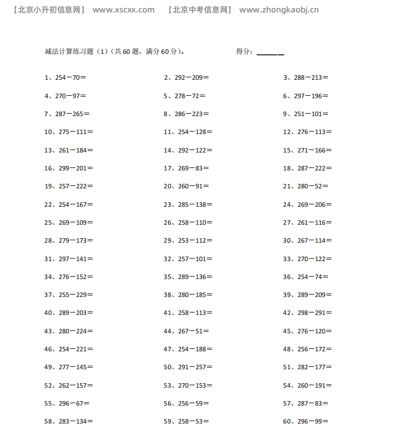 本文含多篇300以内整数减法计算题,每篇60题,包含三位数减三位数 / 两位数运算,覆盖退位减等类型,适配小升初基础训练,帮助学生巩固减法规则,提升运算准确性,和北京小升初信息网一起看看!以下是部分内容截图预览: