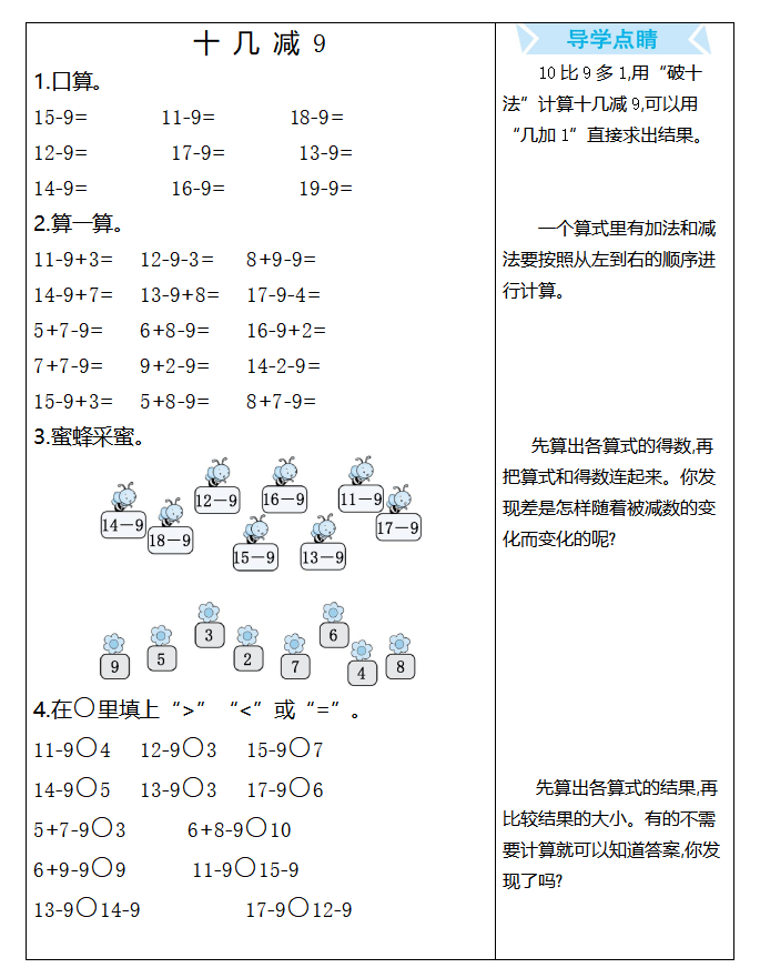 本文为十几减9专项练习,其中含口算、混合运算、比较大小等题型,附答案与破十法解题技巧,适配低段减法入门训练,帮助学生夯实计算基础,和北京小升初信息网一起看看!以下是部分内容截图预览: