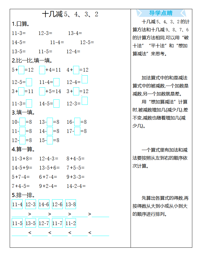 本文为十几减 5、4、3、2 专项练习,含口算、填空、混合运算等题型,附答案与多种解题方法指导,适配低段退位减法训练,帮助学生夯实计算能力,和北京小升初信息网一起看看!以下是部分内容截图预览: