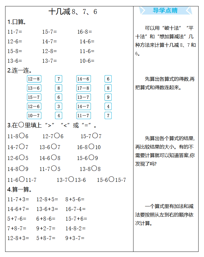 本文为十几减 8、7、6 专项练习,其中含口算、连线、比较大小等题型,附答案与解题方法指导,适配低段退位减法训练,帮助学生夯实计算基础,和北京小升初信息网一起看看!以下是部分内容截图预览: