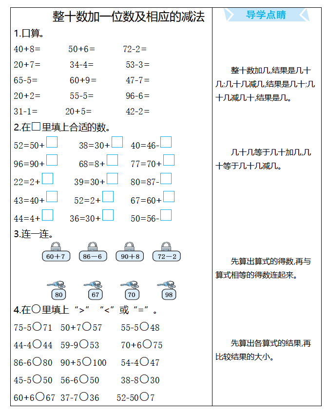 本文为整十数加一位数及相应减法专项练习,含口算、填空、连线等题型,附答案与运算技巧,适配低段数的运算训练,夯实基础计算能力,和北京小升初信息网一起看看!以下是部分内容截图预览: