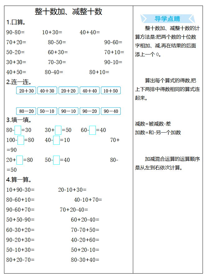 本文为整十数加减整十数专项练习,含口算、连线、混合运算等题型,附答案与核心运算技巧,适配低段数的运算训练,夯实基础计算能力,和北京小升初信息网一起看看!以下是部分内容截图预览:
