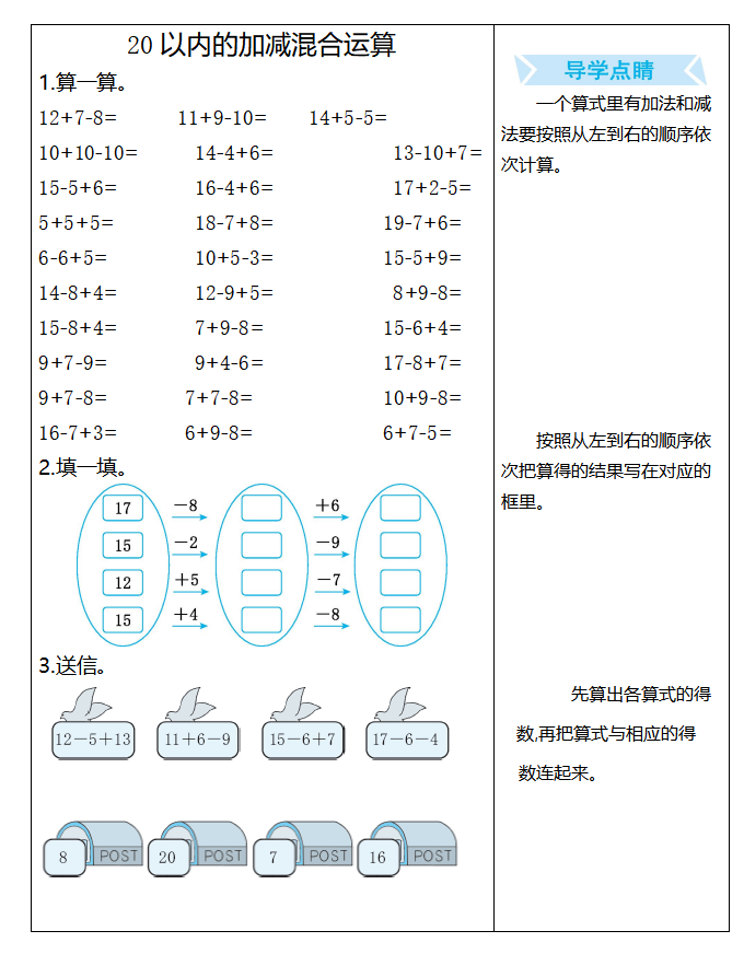 本文为20以内加减混合运算专项练习,含计算、填空、连线题型,附答案与运算顺序技巧,适配低段运算训练,夯实混合计算基础,和北京小升初信息网一起看看!以下是部分内容截图预览: