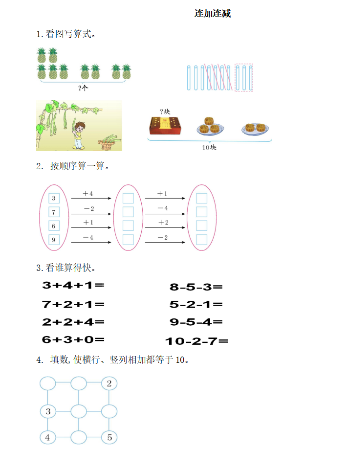 本文为连加连减专项练习,含看图列式、顺序计算、口算、填数题型,附完整答案,适配低段连加连减运算训练,夯实混合运算基础,和北京小升初信息网一起看看!以下是部分内容截图预览: