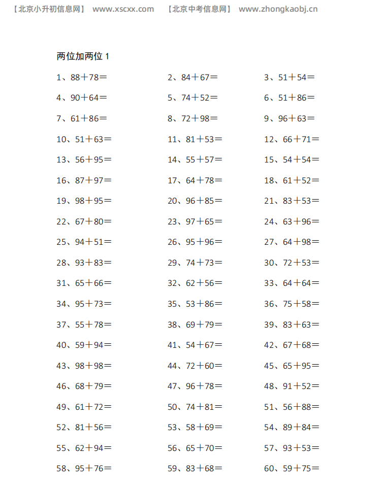 本文为两位数加两位数专项口算练习,每篇60道计算题,题型均为两位数进位加法,题量充足,适配小学中段加法运算专项训练,和北京小升初信息网一起看看!以下是部分内容截图预览: