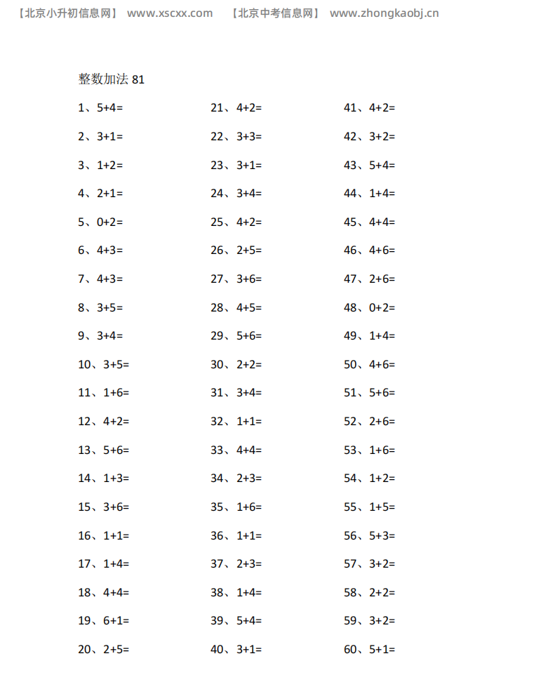 本文为多篇10以内加法专项练习,每篇60道计算题,涵盖基础运算与进位题型,题量充足,适配小学低段加法口算巩固训练,和北京小升初信息网一起看看!以下是部分内容截图预览: