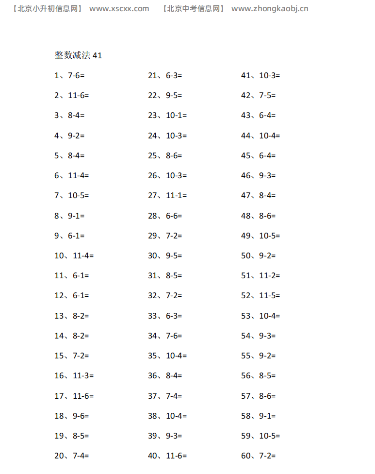 本文为多篇11以内减法专项练习,每篇60道计算题,包含10至11减个位数核心题型,题量充足,适配小学低段减法口算巩固训练,和北京小升初信息网一起看看!以下是部分内容截图预览: