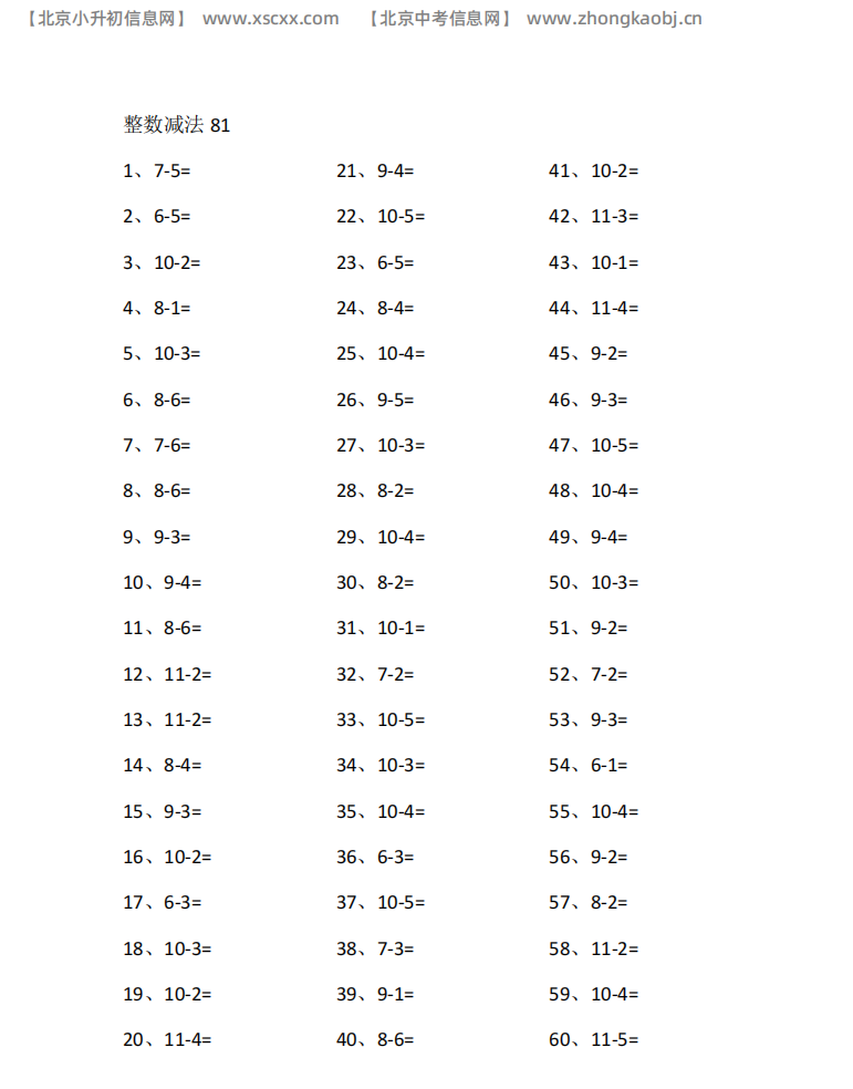 本文为多篇11以内减法专项练习,每篇60道计算题,含纯文字与表格排版,包含10至11减个位数核心题型,题量充足,适配小学低段减法口算冲刺训练,和北京小升初信息网一起看看!以下是部分内容截图预览:
