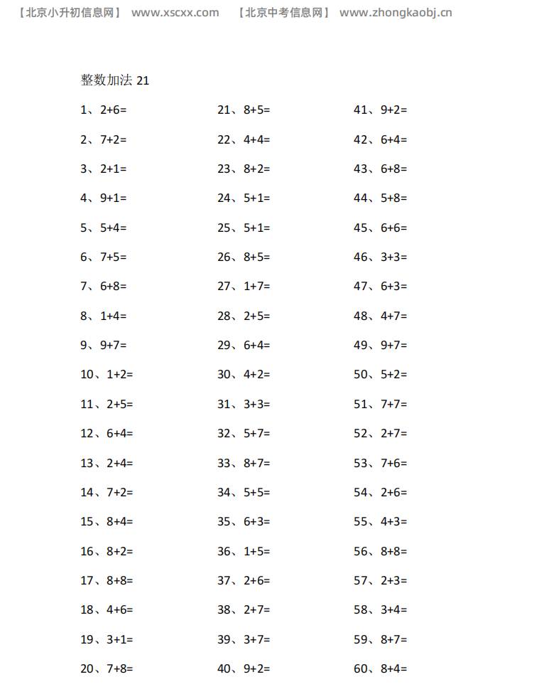 本文为多篇20以内加法专项练习,每篇60道计算题,侧重进位加法核心题型,题量充足,适配小学低中段加法口算进阶训练,和北京小升初信息网一起看看!以下是部分内容截图预览: