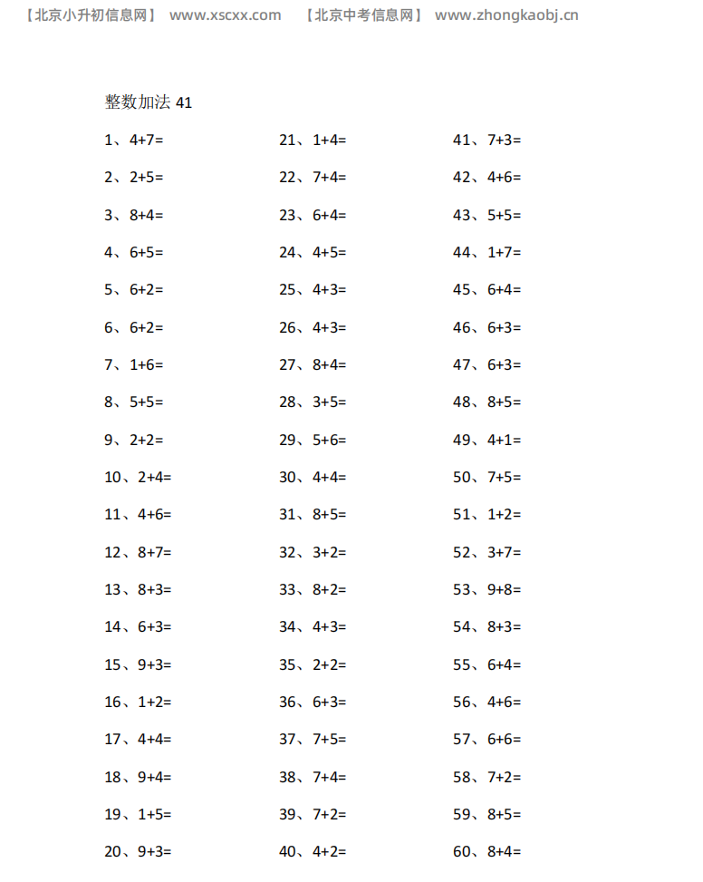 本文为多篇20以内加法专项练习,每篇60道计算题,涵盖基础与进位加法高频题型,题量充足,适配小学低中段加法口算巩固训练,和北京小升初信息网一起看看!以下是部分内容截图预览: