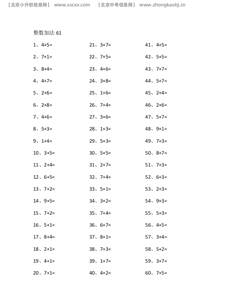 本文为多篇20以内加法专项练习,每篇60道计算题,侧重进位加法高频考点,题量充足,适配小学低中段加法口算强化训练,和北京小升初信息网一起看看!以下是部分内容截图预览: