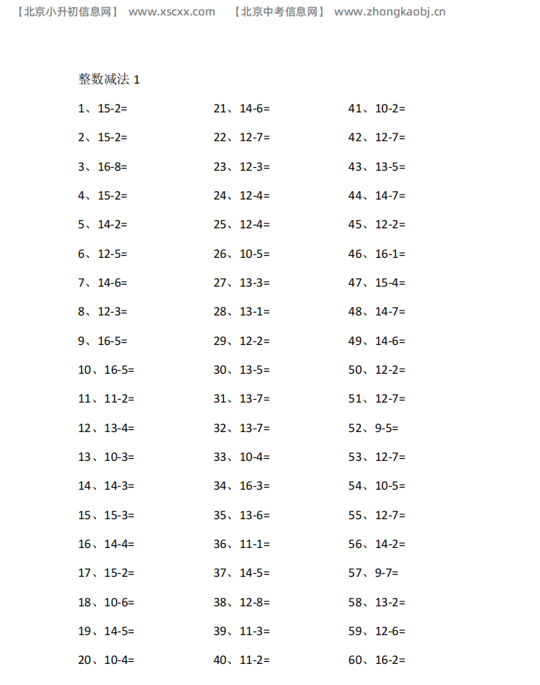 本文为多篇20以内减法专项练习,每篇60道计算题,覆盖退位与基础题型,题量充足,适配小学低中段减法口算启蒙训练,和北京小升初信息网一起看看!以下是部分内容截图预览: