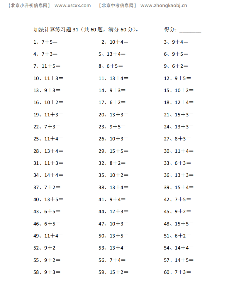 本文为多篇20以内加法专项练习,每篇60道计算题,含基础与进位题型,题量充足,适配小学低段加法口算进阶训练,和北京小升初信息网一起看看!以下是部分内容截图预览: