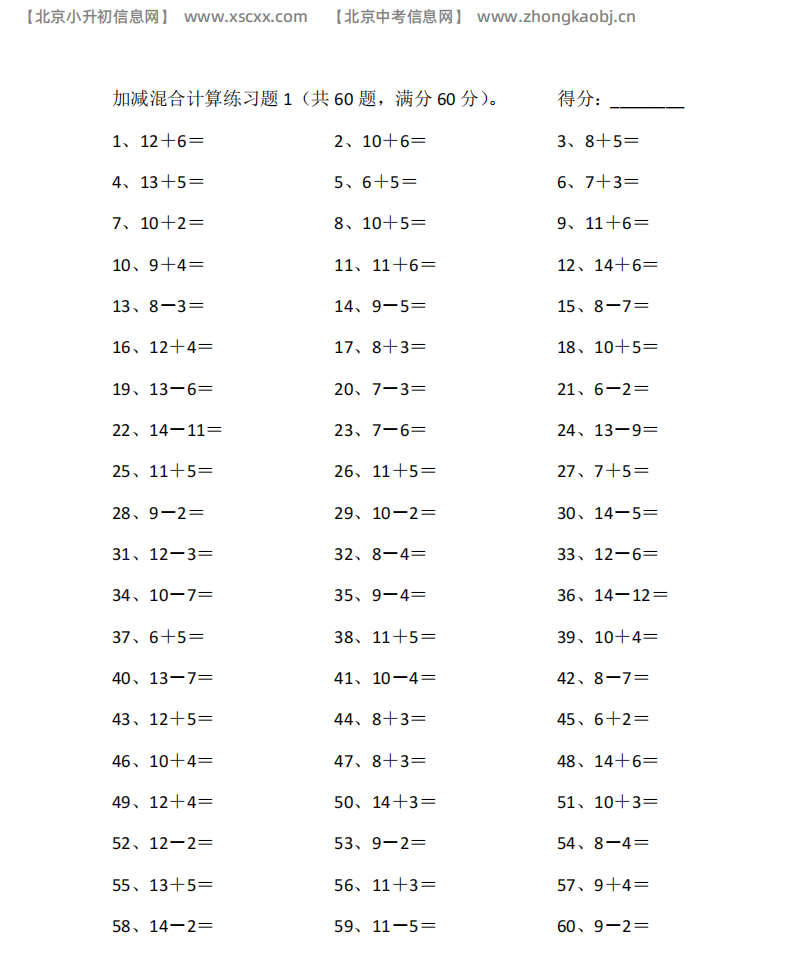 本文为多篇20以内混合加减专项练习,每篇60道计算题,涵盖加法、减法综合题型,适配小学低中段加减混合运算启蒙训练,和北京小升初信息网一起看看!以下是部分内容截图预览: