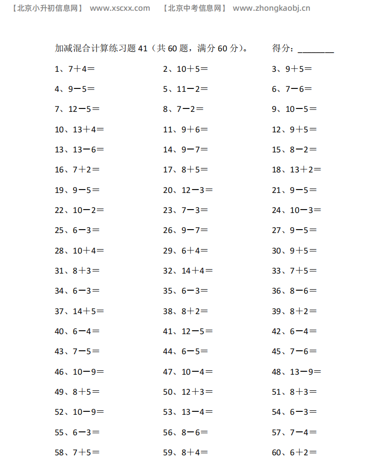 本文为多篇20以内混合加减专项练习,每篇60道计算题,涵盖加减综合难点题型,适配小学低中段混合运算巩固训练,和北京小升初信息网一起看看!以下是部分内容截图预览: