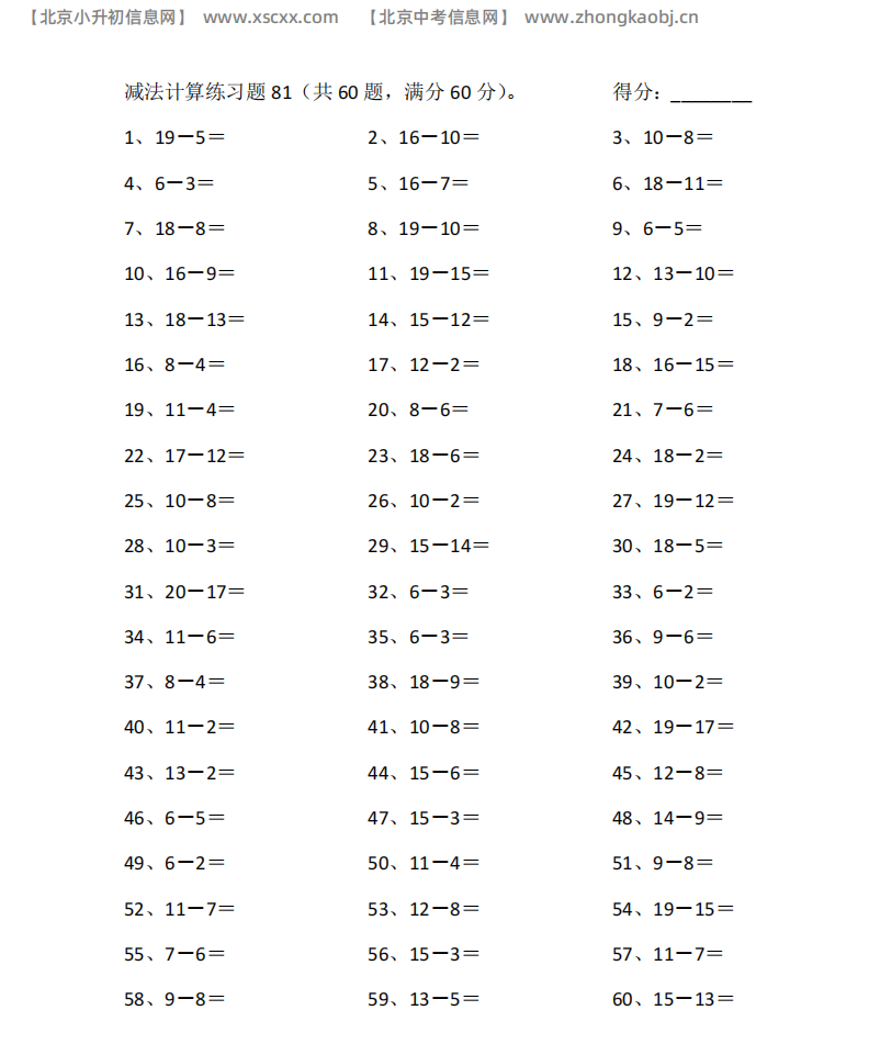本文为多篇20以内减法专项练习,每篇60道计算题,涵盖退位减法综合题型,题量充足,适配小学低中段减法口算冲刺训练,和北京小升初信息网一起看看!以下是部分内容截图预览: