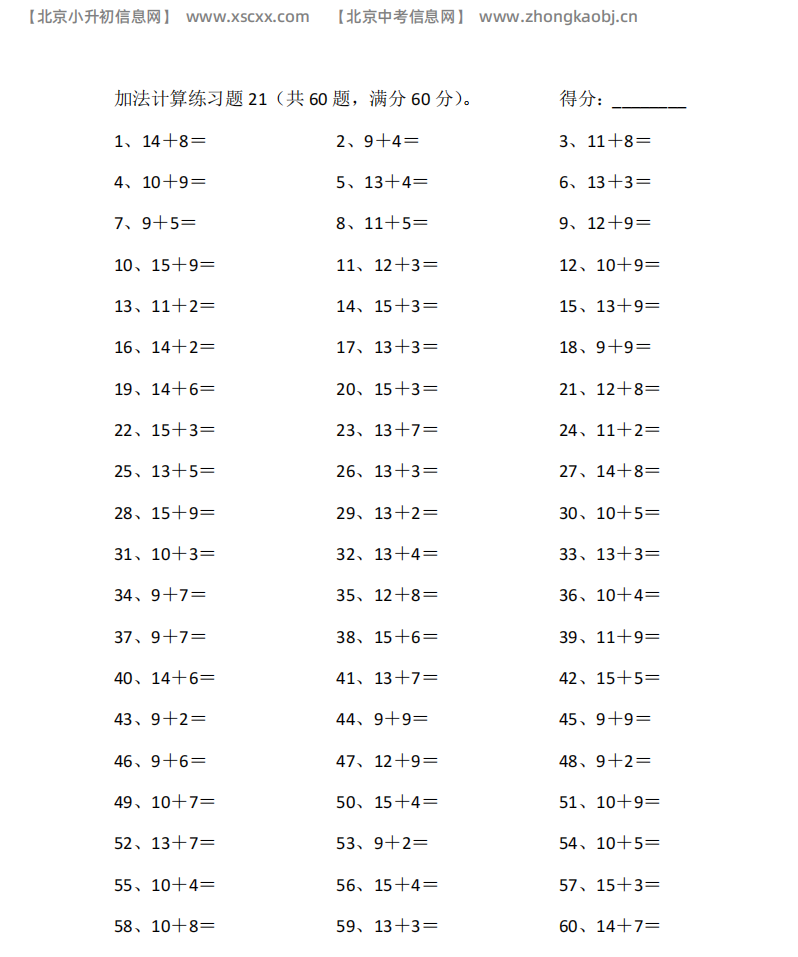 本文为多篇20以内加法专项练习,每篇60道计算题,含基础与进位高频题型,题量充足,适配小学低段加法口算进阶训练,和北京小升初信息网一起看看!以下是部分内容截图预览: