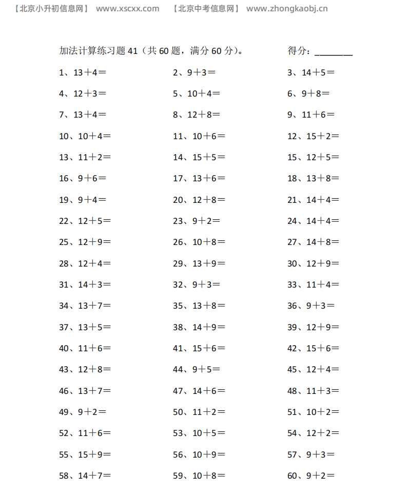 本文为多篇20以内加法专项练习,每篇60道计算题,含进位核心与高频题型,题量充足,适配小学低段加法口算巩固训练,和北京小升初信息网一起看看!以下是部分内容截图预览: