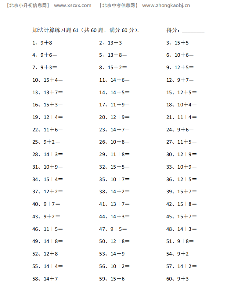本文为多篇20以内加法专项练习,每篇60道计算题,涵盖进位与综合高频题型,题量充足,适配小学低段加法口算强化训练,和北京小升初信息网一起看看!以下是部分内容截图预览: