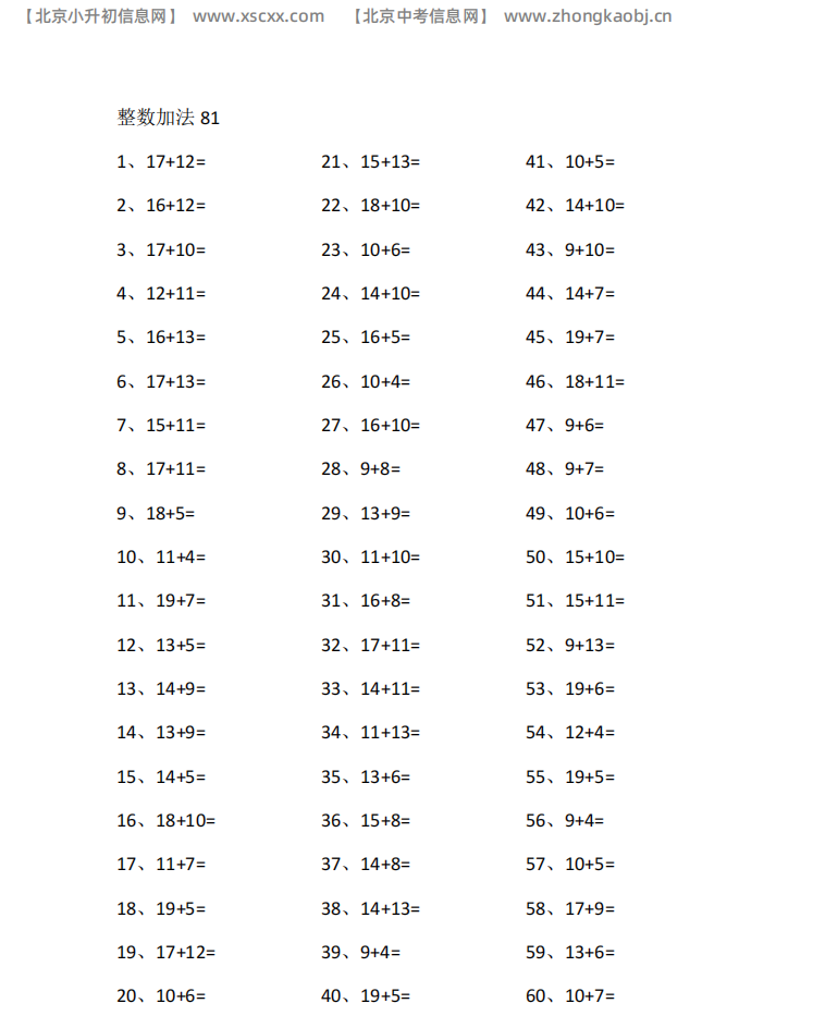 本文为多篇20以内加法专项练习,每篇60道计算题,含进位综合与冲刺题型,题量充足,适配小学低段加法口算冲刺训练,和北京小升初信息网一起看看!以下是部分内容截图预览: