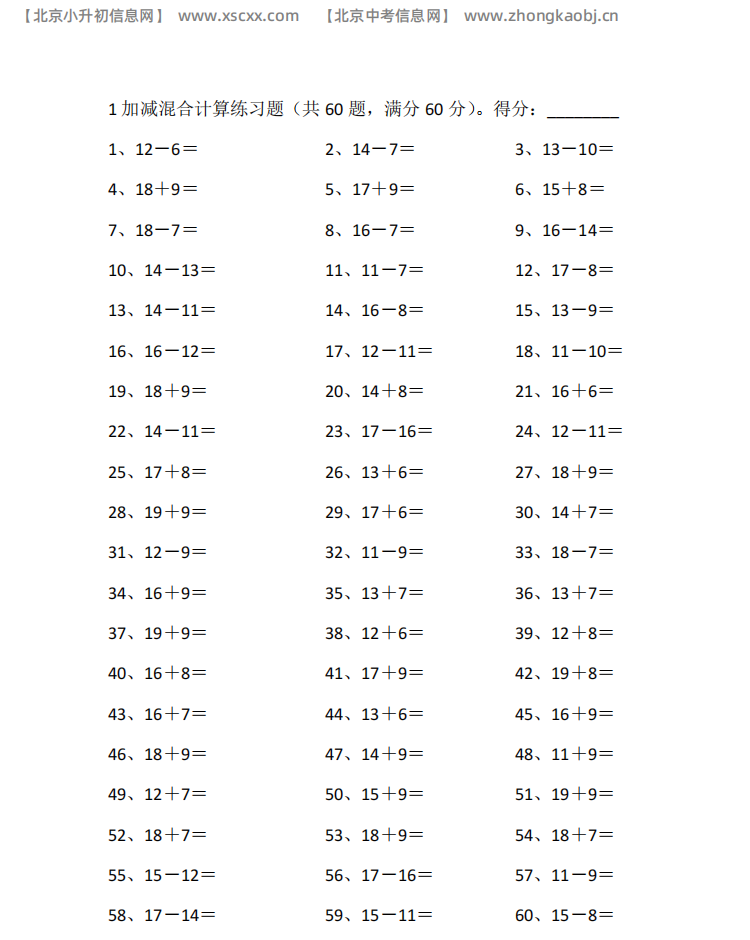 本文为多篇20以内加减混合专项练习,每篇60道计算题,含基础加减题型,题量充足,适配小学低段加减混合口算启蒙训练,和北京小升初信息网一起看看!以下是部分内容截图预览: