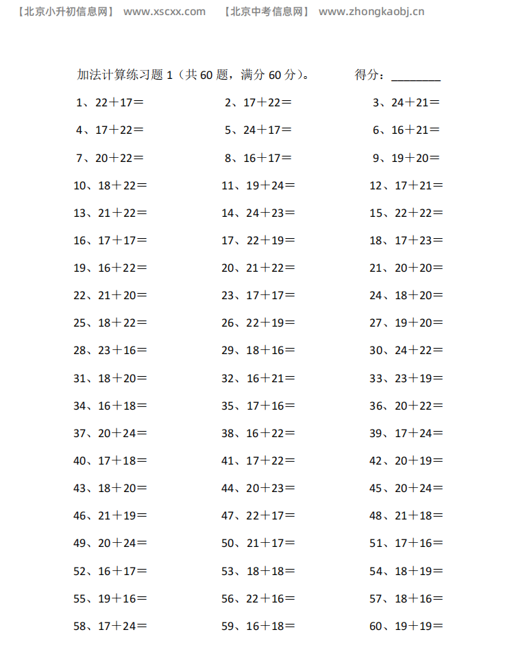 本文为多篇20以内加法专项练习,每篇60道计算题,含基础与进位题型,题量充足,适配小学低段加法口算启蒙训练,和北京小升初信息网一起看看!以下是部分内容截图预览: