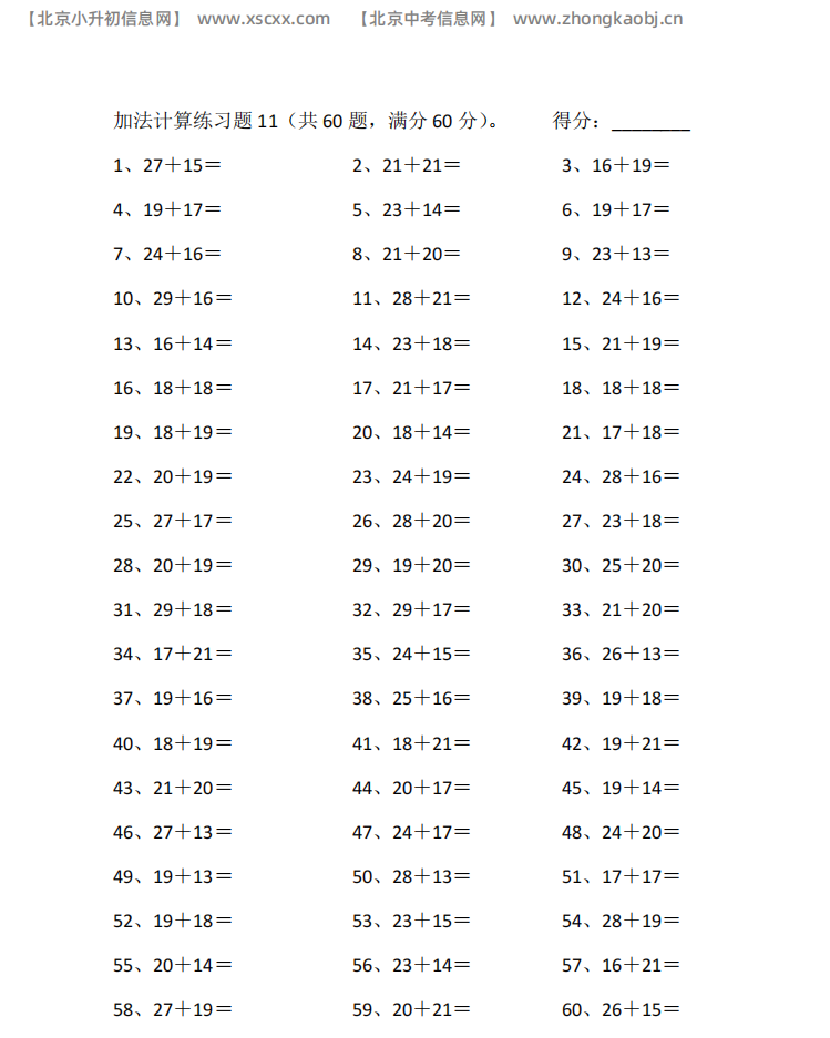 本文为多篇20以内加法专项练习,每篇60道计算题,含进位高频题型,题量充足,适配小学低段加法口算进阶训练,和北京小升初信息网一起看看!以下是部分内容截图预览: