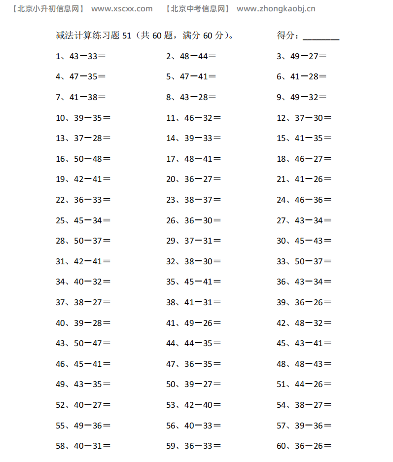 本文为多篇20以内减法专项练习,每篇60道计算题,含退位强化题型,题量充足,适配小学低中段减法口算强化训练,和北京小升初信息网一起看看!以下是部分内容截图预览: