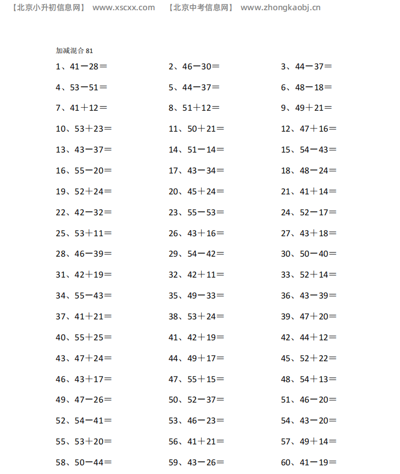 本文为多篇41-55加减混合专项练习,每篇60道计算题,含加减综合收官冲刺题型,题量充足,适配小学中段加减混合口算收官训练,和北京小升初信息网一起看看!以下是部分内容截图预览: