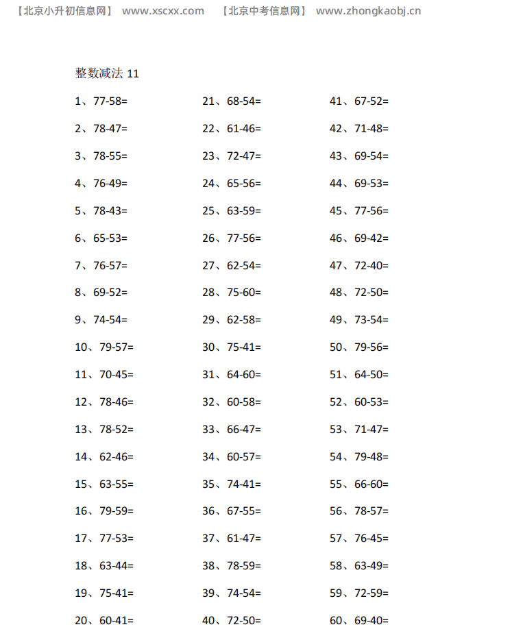 本文含多篇60-80以内减法练习,每篇60道计算题,包含退位减法难点,题型规范、题量充足,适合小学低年级口算巩固与提升,和北京小升初信息网一起看看!以下是部分内容截图预览: