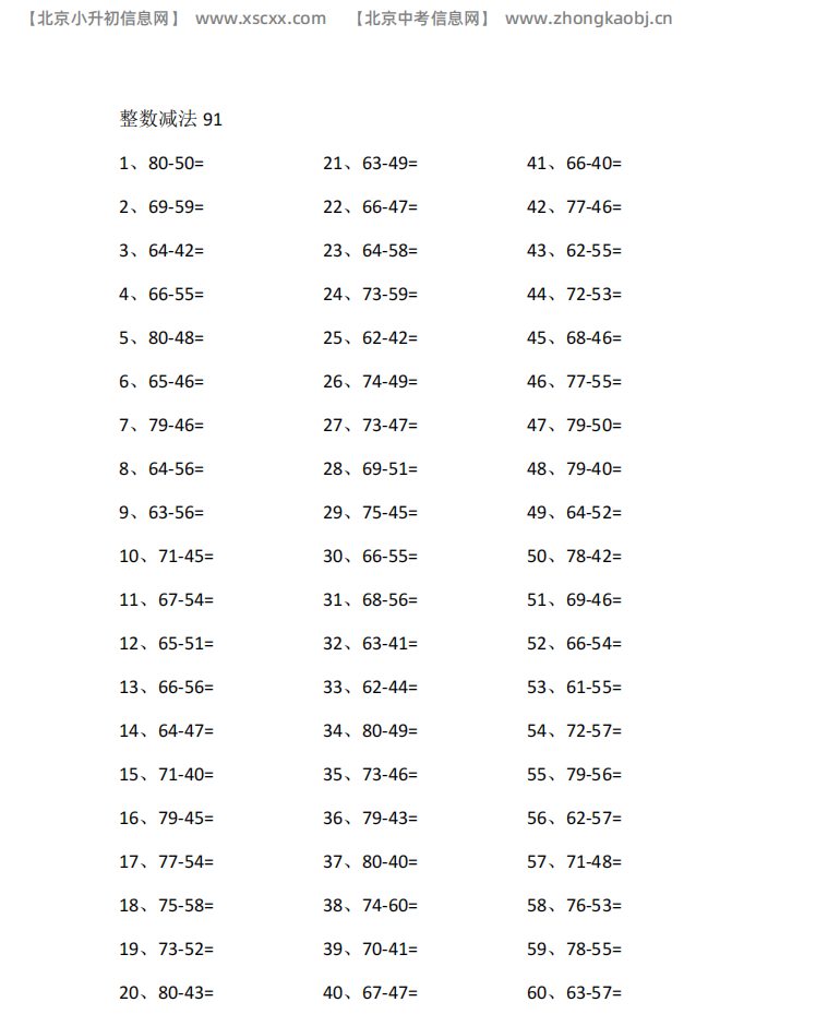 本文含多篇60-80以内减法练习,每篇60道计算题,包含退位减法综合收官训练,题型规范,适配小学低年级口算最终巩固提升,和北京小升初信息网一起看看!以下是部分内容截图预览: