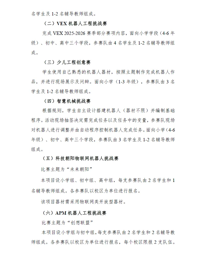 2025 北京市学生机器人智能大赛朝阳区选拔赛通知正式发布!作为市级科技节系列活动的区级选拔,赛事覆盖小初高全学段,设工程挑战、创意设计等多赛项。优胜队伍将晋级市赛,各校需速查报名要求、流程及安全须知,抓紧筹备!