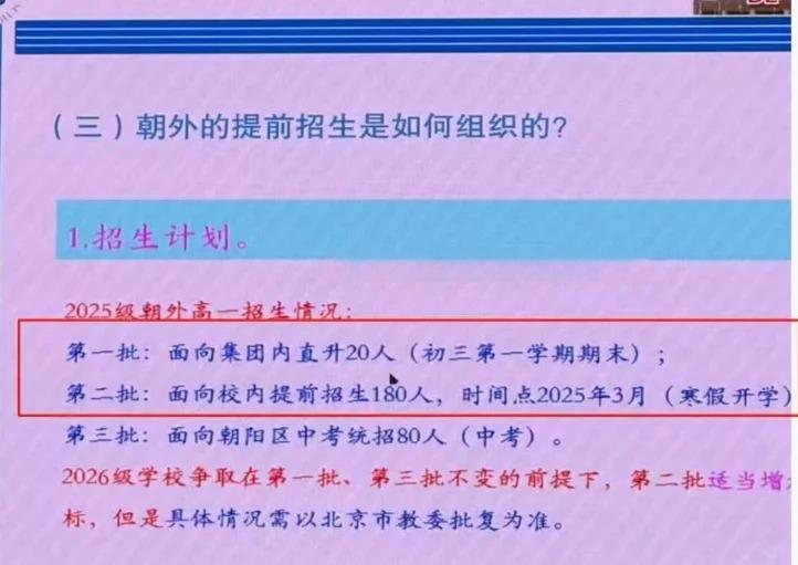 从2025级朝外高一招生计划就能清晰看出这种升学特点。第一批是面向集团内的直升招生,名额有20人,且选拔时间在初三第一学期期末,这意味着集团内的学生若想通过直升进入朝外高中,初三上学期的学习就已进入关键的升学赛道。第二批则是面向校内的提前招生,名额达到180人,时间点在2025年3月,也就是寒假开学后不久,校内学生的竞争在这个阶段会更为集中。而面向朝阳区的中考统招名额仅为80人,对比校内直升和提前招生的名额,统招的机会相对较少。