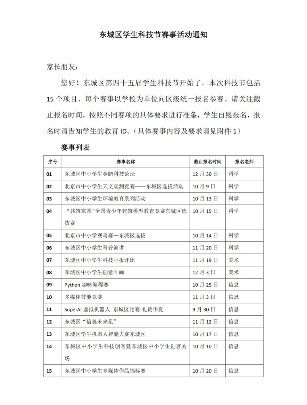 东城区第四十五届学生科技节正式启动啦!本次科技节涵盖15个丰富赛事,以学校为单位统一报名,学生可自愿参与。