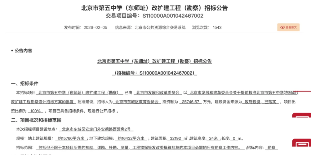 2026年2月5日,北京市公共资源交易服务平台正式发布《北京市第五中学(东师址)改扩建工程(勘察)招标公告》。这意味着,面对持续至少十年的中学入学高峰,北京市东城区应对入学高峰、优化教育资源布局的规划,已从纸面全面转入实质性、大规模的建设攻坚阶段。