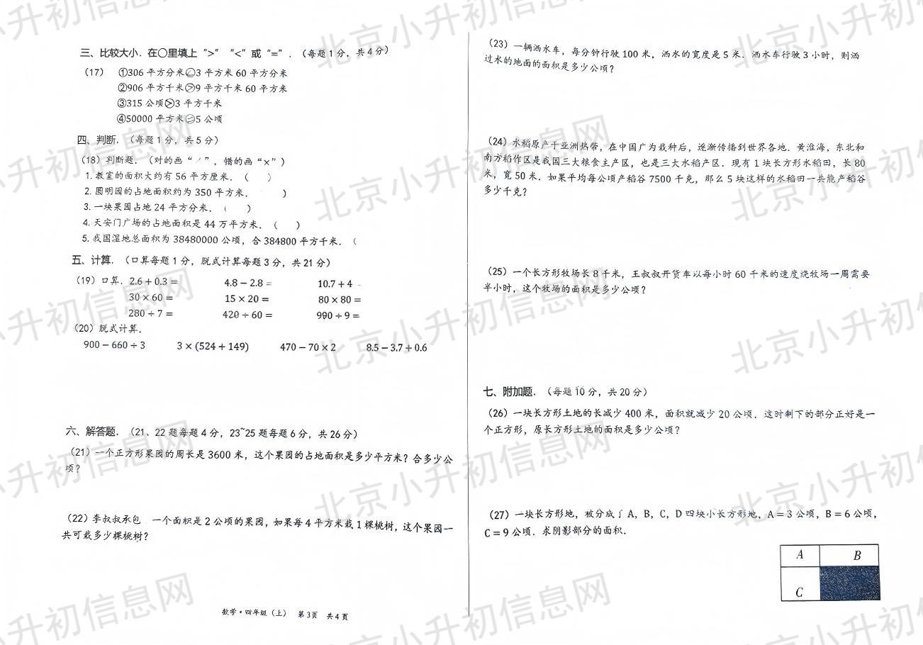 今天北京小升初信息网为四年级的同学和家长分享一套2025~2026学年度第一学期四年级数学学业水平自我诊断试卷(聚焦第二单元“土地面积相关知识”)。这套试卷围绕“公顷、平方千米、平方米”等面积单位的认知与应用展开,能帮助大家检验对该单元知识的掌握程度,快来一起看看吧~