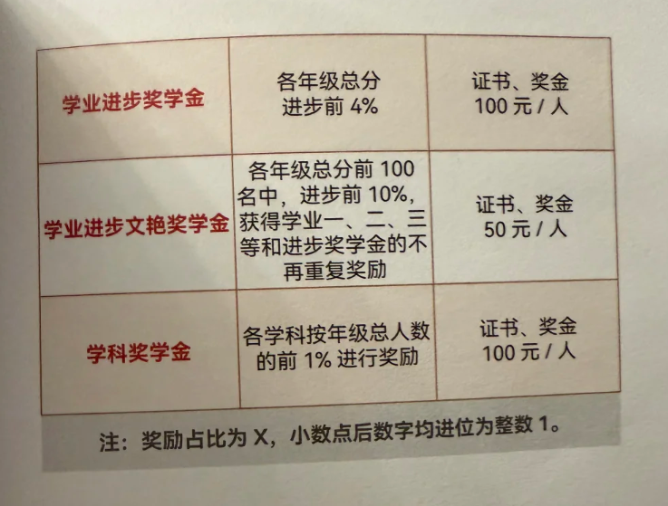 学业进步奖学金:奖励各年级总分进步前4%的学生,颁发证书并给予100元/人的奖金,肯定学生在学业上的突破与成长。