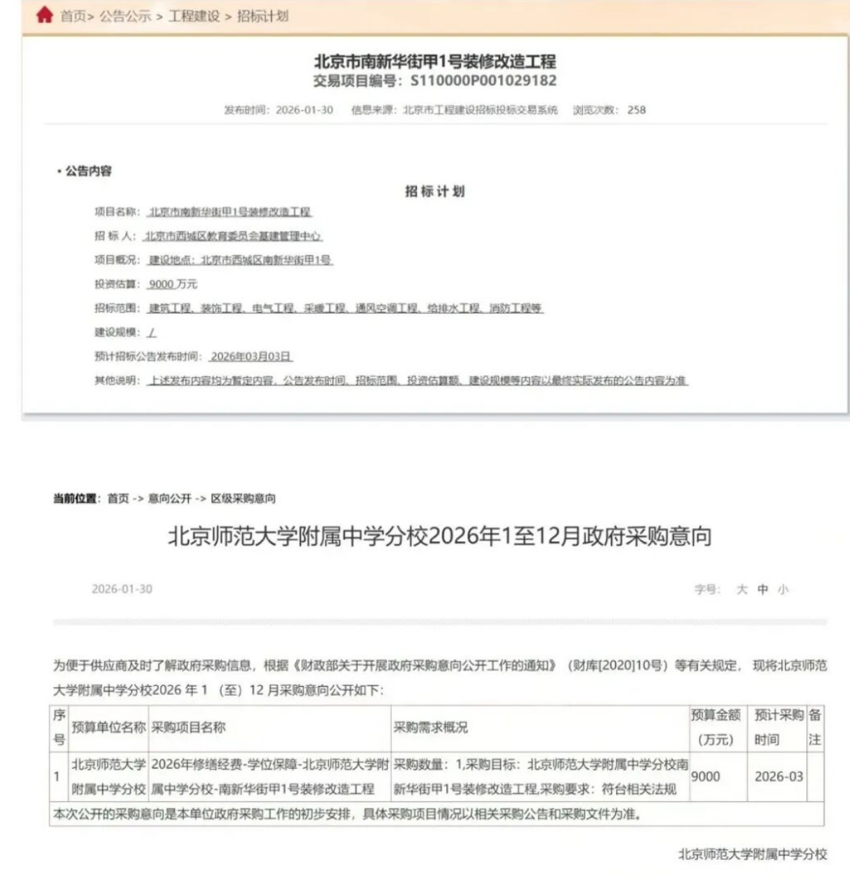 从官方公示信息来看,本次改造工程规格颇高,由北京市西城区教育委员会基建管理中心作为招标人,总投资估算达9000万元,该预算金额也同步出现在北师大附属中学分校2026年政府采购意向清单中,采购项目明确为南新华街甲1号装修改造工程,预计采购时间为2026年3月。工程招标范围覆盖建筑、装饰、电气、采暖、通风空调、给排水、消防等多个领域,全方位保障校区硬件设施的建设质量,相关招标公告预计将于2026年3月3日正式发布,具体建设细节将以实际公告内容为准。