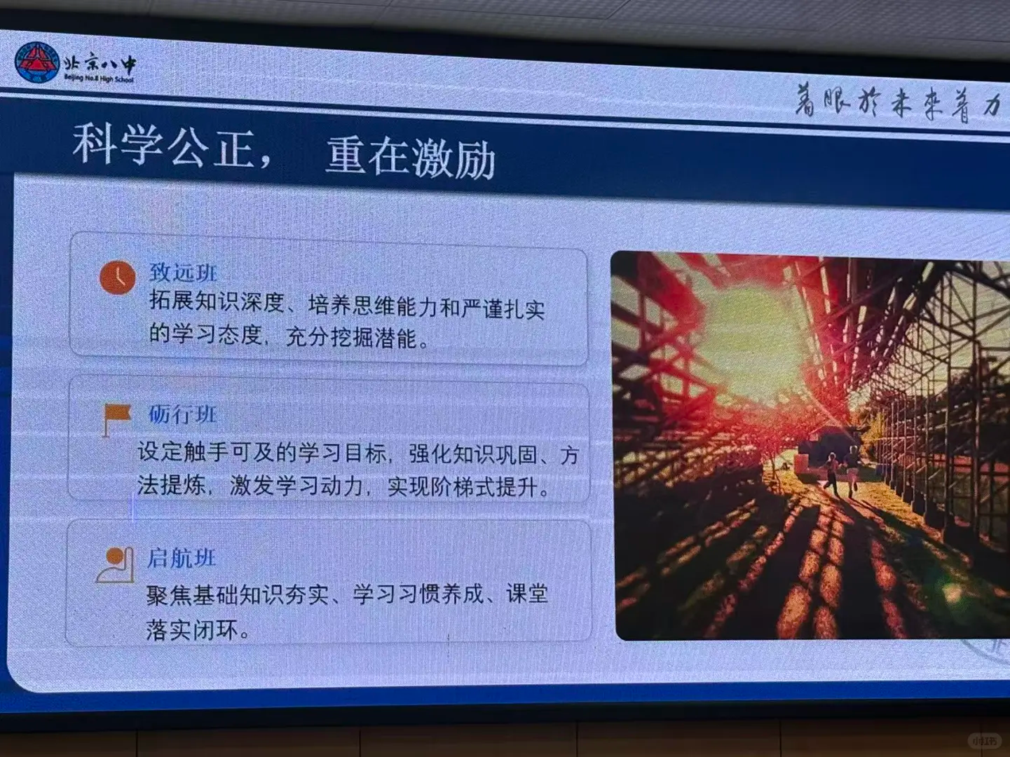 北京八中初中部以 “科学公正,重在激励” 为原则,将数英学科分为三个层级班型,各有明确培养目标: