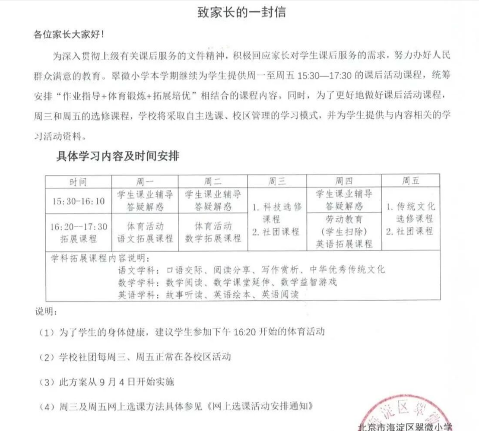 新学期伊始,翠微小学的课后活动课程备受学生和家长期待。课程语数英等多个领域,助力学生全面发展,具体安排如下,跟北京小升初信息网一起来看看吧。